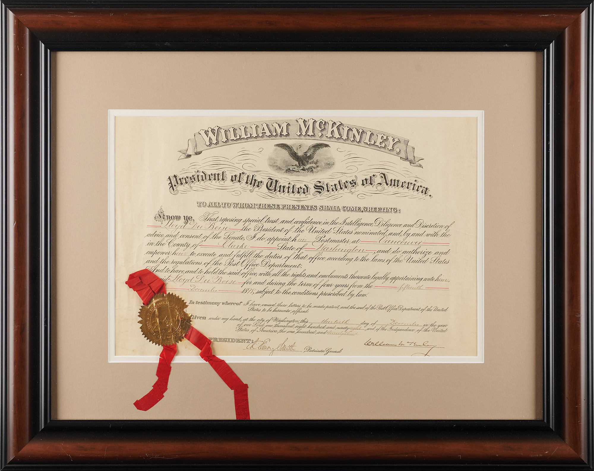 Partly-printed DS as president, one page, 17.5 x 11.25, December 30, 1898. President McKinley appoints Lloyd Du Boise as "Postmaster at Vancouver, in the County of Clarke, State of Washington." Neatly signed at the conclusion in ink by President William McKinley and countersigned by Postmaster General Charles Emory Smith. The gold foil seal and red ribbon affixed at the lower left remain mostly intact. Double-matted and framed to an overall size of 28.5 x 22.5. In very good to fine condition, with overall light creasing, heavier in the side margins.