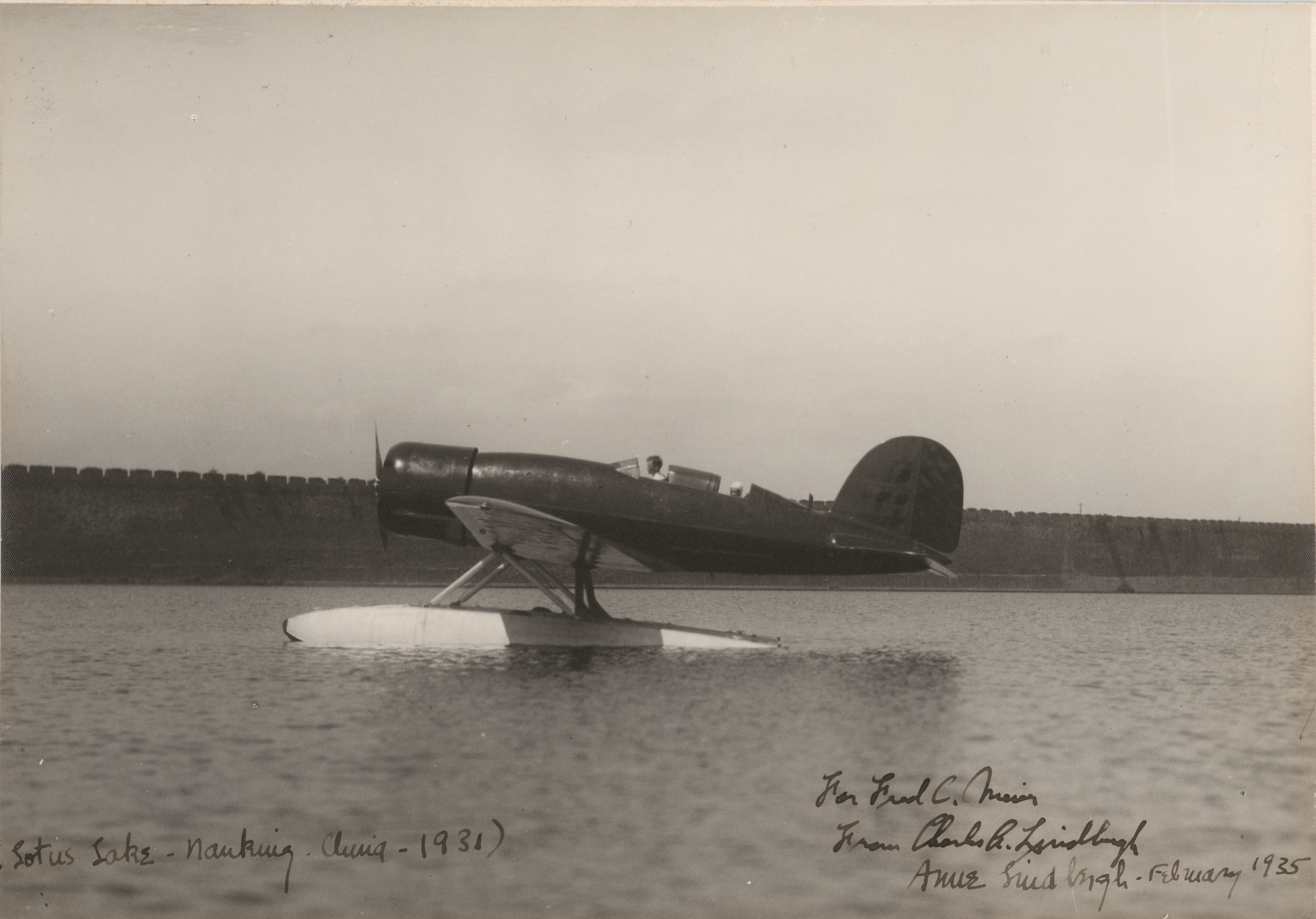 Vintage textured matte-finish 10.5 x 7.5 photo of the Lindeberghs' Lockheed Sirius seaplane 'Tingmissartoq' on Lotus Lake in China, signed and inscribed in fountain pen, "For Fred C. Meier, From Charles A. Lindbergh" and "(Lotus Lake—Nanking, China—1931), Anne Lindbergh, February 1935.” In fine condition, with lightly trimmed edges. Accompanied by a full letter of authenticity from Beckett Authentication Services.