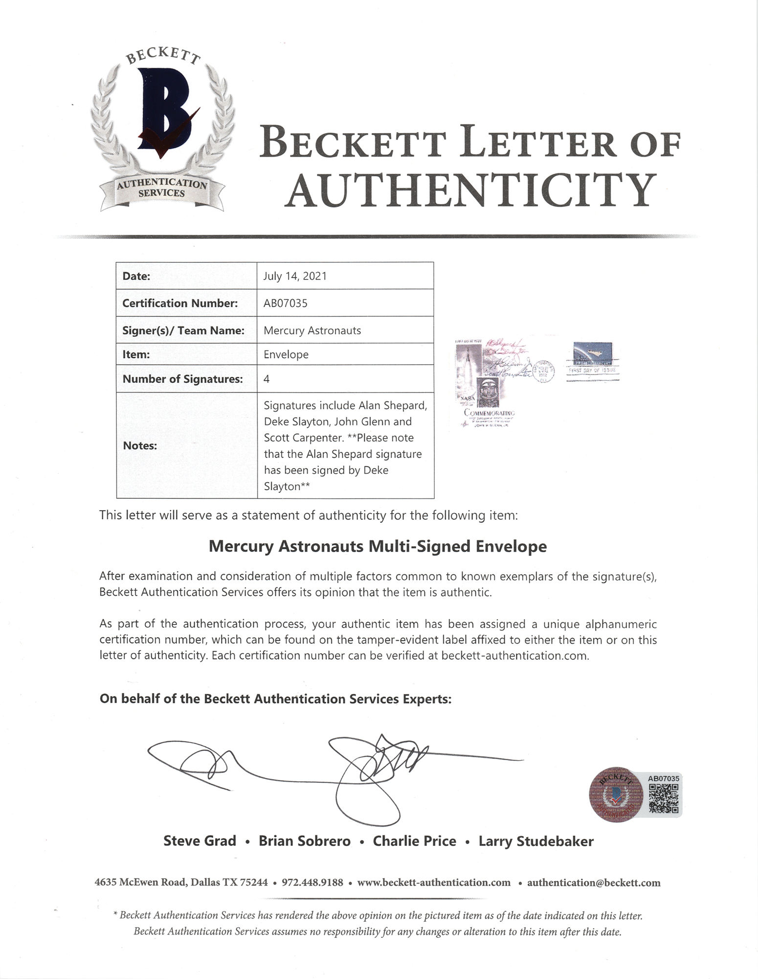 FDC with a cachet honoring John Glenn's successful Friendship 7 orbital flight, signed in ballpoint by three Mercury astronauts: Deke Slayton, John Glenn, and Scott Carpenter, with Slayton also signing for Alan Shepard. In fine condition, with some light soiling. Accompanied by a full letter of authenticity from Beckett Authentication Services.