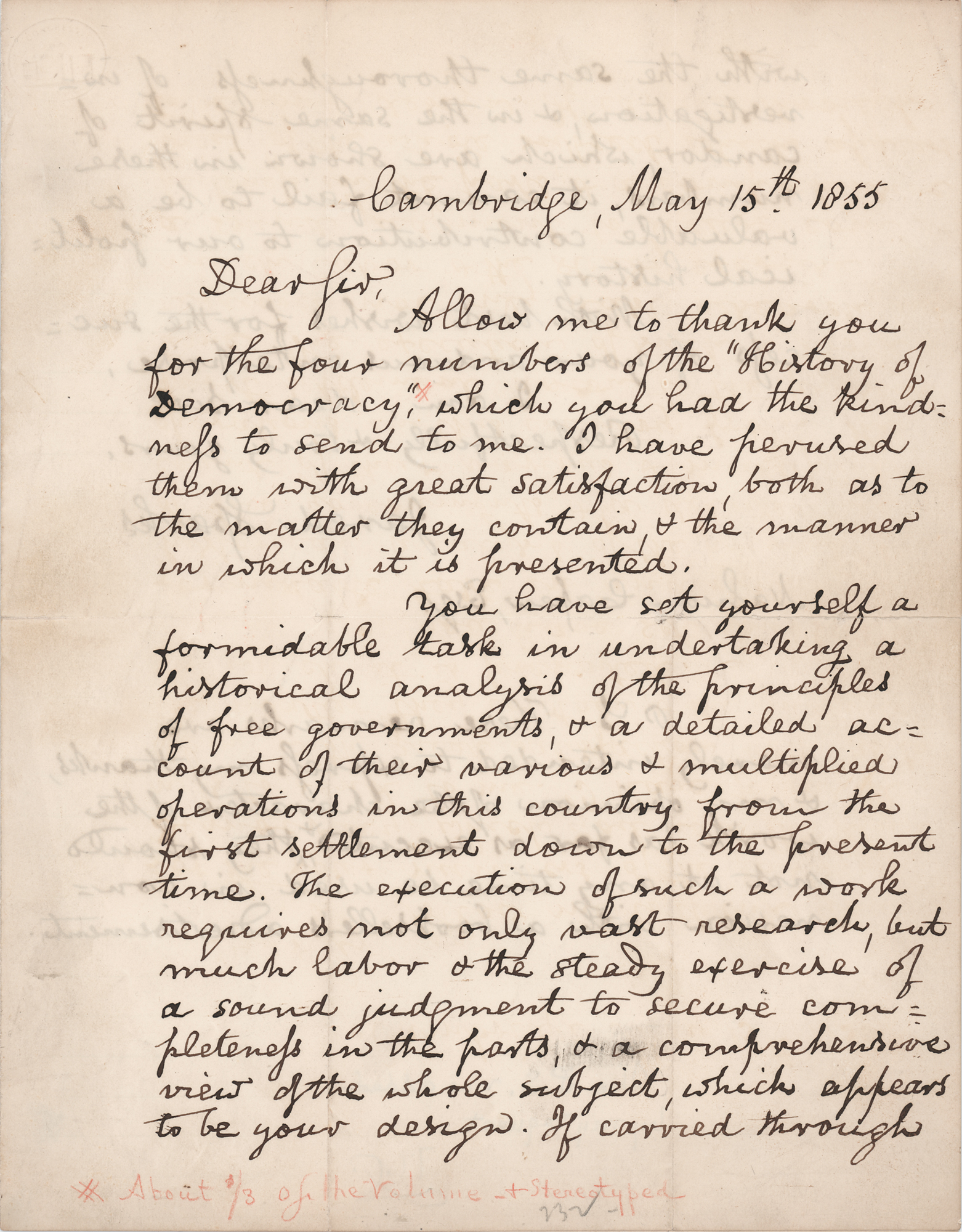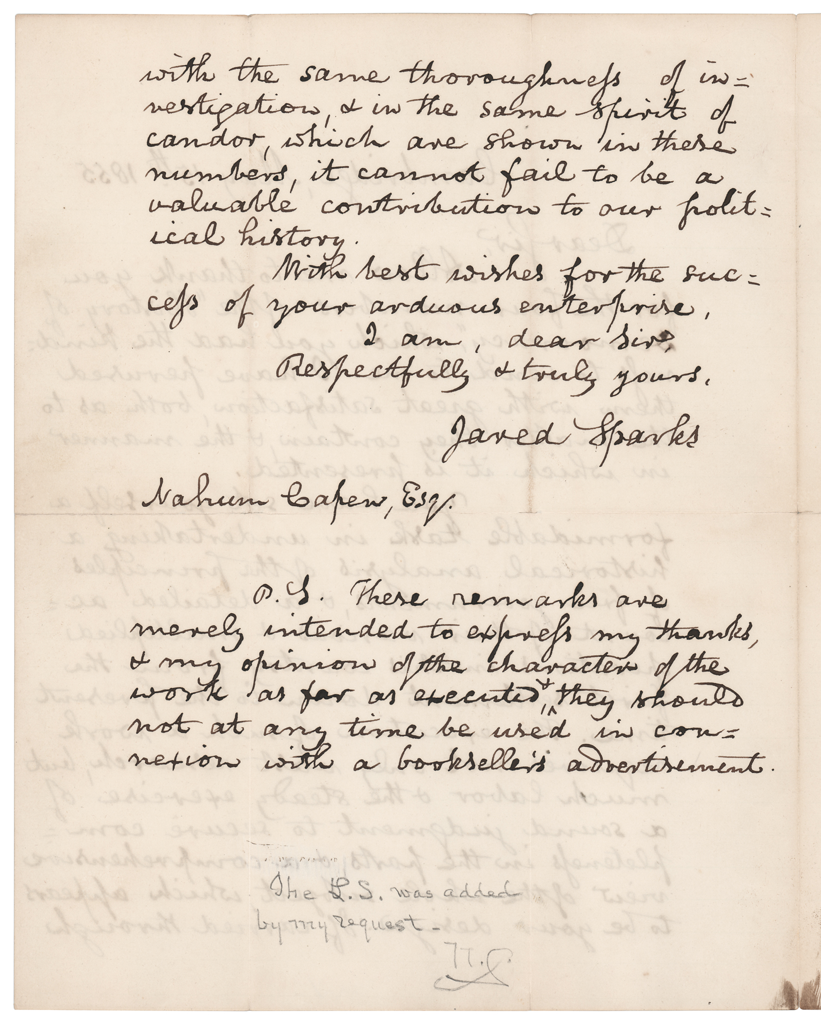 American historian and educator (1789–1866) who served as president of Harvard from 1849 to 1853. ALS, one page both sides, 7.75 x 10, May 15, 1855. Handwritten letter to Boston writer and publisher Nahum Capen, in part: "Allow me to thank you for the four numbers of the 'History of Democracy,' which you had the kindness to send to me. I have perused them with great satisfaction, both as to the matter they contain, & the manner in which it is presented. You have set yourself a formidable task in undertaking a historical analysis of the principles of free governments, & a detailed account of their various & multiplied operations in this country from the first settlement down to the present time. The execution of such a work requires not only vast research, but much labor & the steady exercise of a sound judgment to secure completeness in the parts, & a comprehensive view of the whole subject, which appears to be your design. If carried through with the same thoroughness of investigation, & in the same spirit of candor, which are shown in these numbers, it cannot fail to be a valuable contribution to our political history." In very good to fine condition, with splitting to the central horizontal fold.