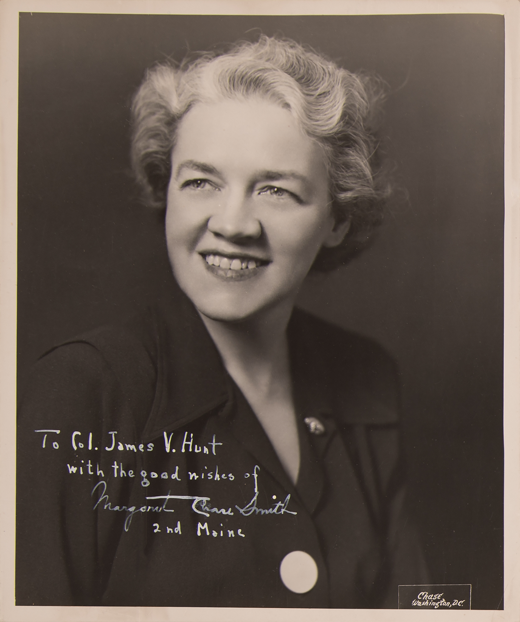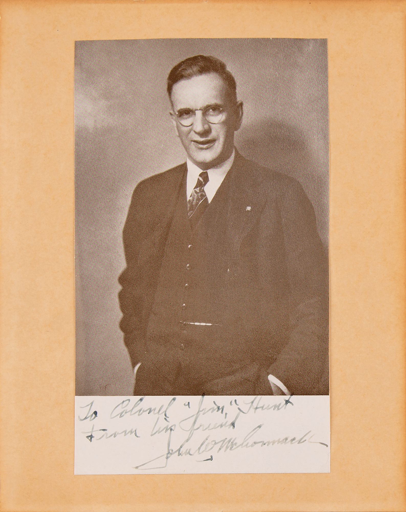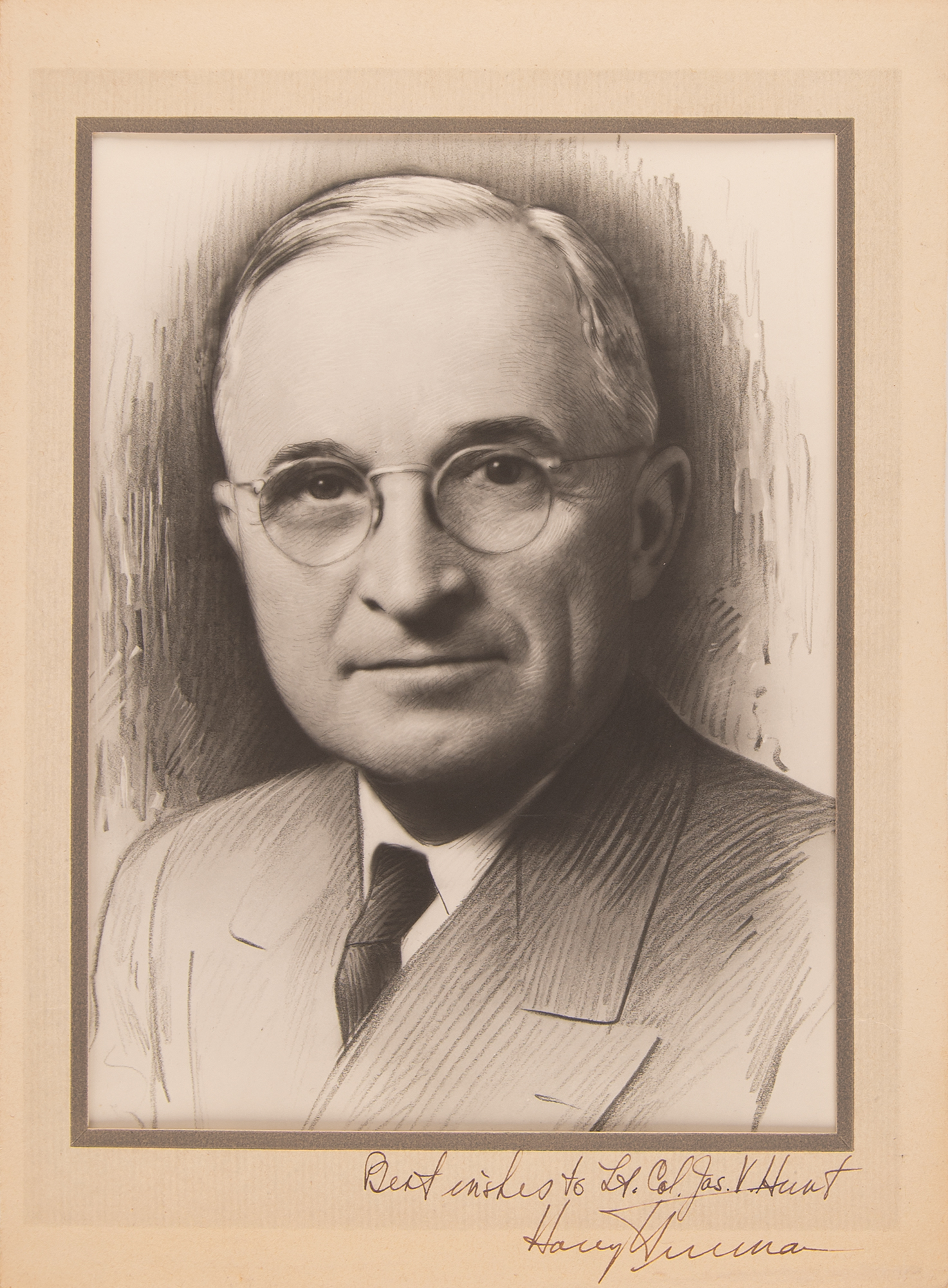 Collection of approximately 60 period photographs of politicians associated with President Harry S. Truman’s cabinet and contemporary members of the United States Senate and House of Representatives, circa 1944, each signed and inscribed in ink and fountain pen to Washington general counsel Lt. Col. James V. Hunt. Highlighted figures include Harry S. Truman, Margaret Chase Smith, Robert M. La Follette Jr., Joseph McCarthy, A. B. “Happy” Chandler, and John W. McCormack, among numerous others from mid-20th century American political life. Housed in a leather-bound three-ring binder. In overall fine condition.