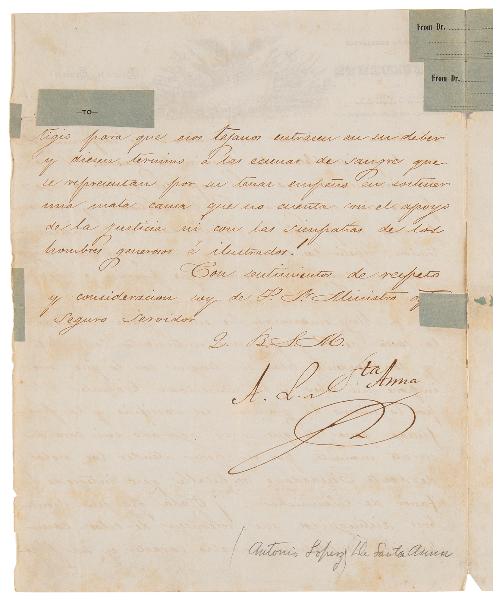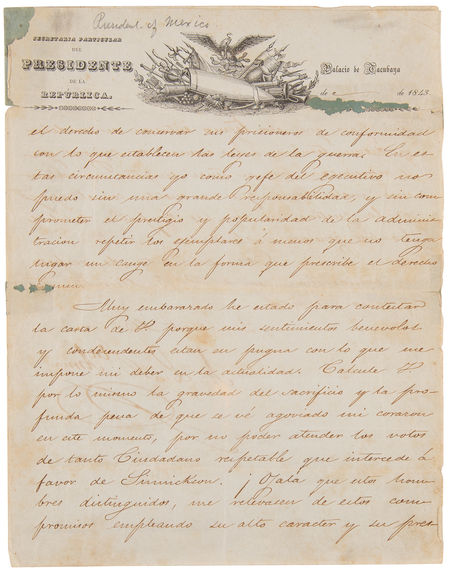 LS in Spanish, signed “A. L. de Sta. Anna,” one page, 8.25 x 10.5, Secretaria Particular del Presidente de la Republica letterhead, 1843. Written from the Palace of Tacubaya during Santa Anna's third presidential term, this letter addresses – and firmly declines – an appeal for the release or favorable treatment of a prisoner. The text, in part (translated): “the right of saving a prisoner according to the laws of war. In these circumstances I as chief executive can without great responsibility, and without compromising the prestige and popularity of the administration repeat the examples unless an exchange takes place in the manner that is prescribed by…law. I have been very…to answer the letter from G. because my benevolent sentiments and indulgences are in opposition with what he informs me presently. I calculate both the gravity of the sacrifice and the deep pain from which my heart is suffering in this moment, not being able to attend to the desires of so many respectable citizens who intercede on behalf of [prisoner]. I hope these distinguished men reveal these compromises employing their high character and their prestige so these Texans fulfill their duty and end the bloody scenes that are represented by sustaining a bad cause that does not enjoy the support of justice nor the sympathy of generous and illustrious men.” In very good to fine condition, with odd old repairs to small areas of paper loss and fold splits.