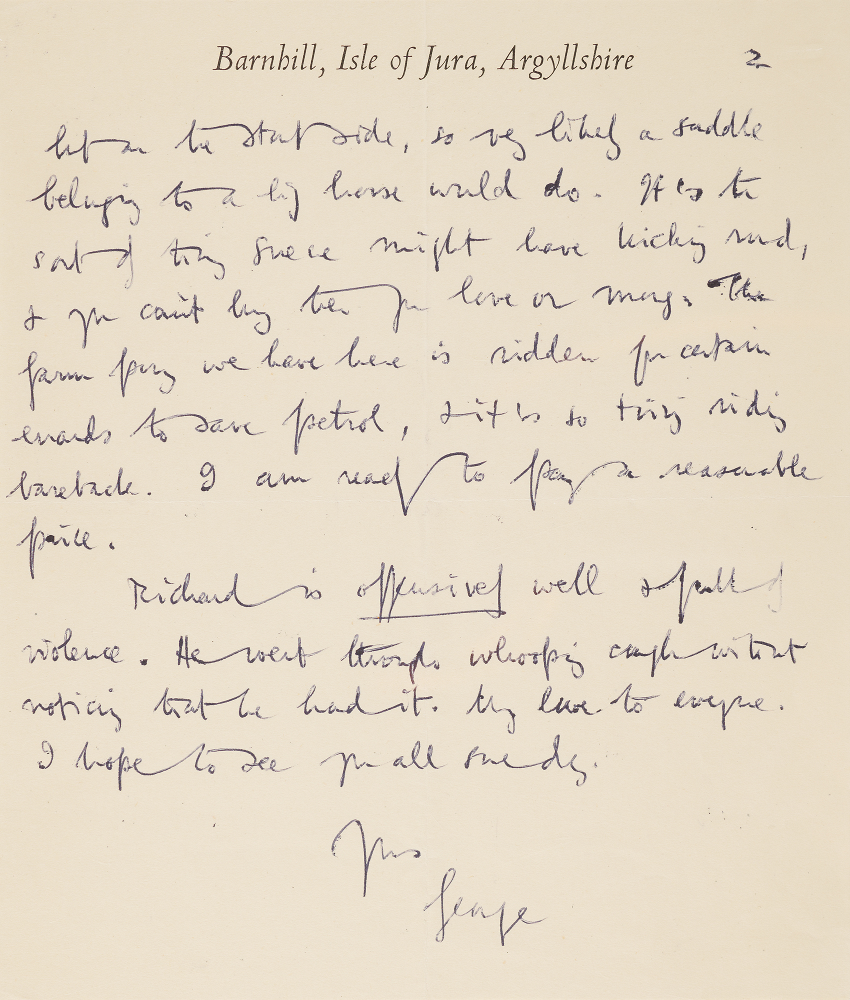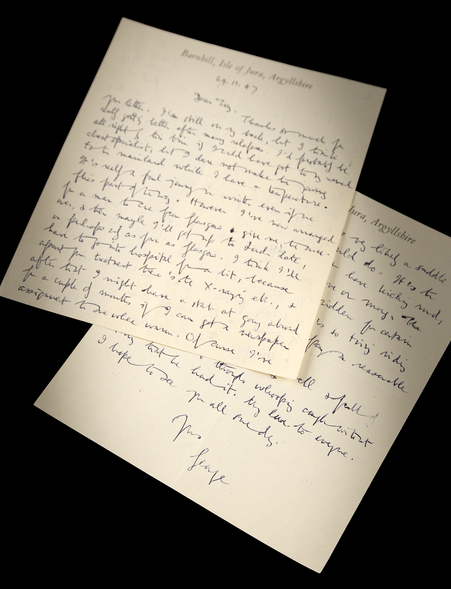 ALS signed “George,” three pages on two sheets, 6.75 x 8, Barnhill, Isle of Jura, Argyllshire letterhead, November 29, 1947. Handwritten letter to novelist Anthony Powell, sent during the composition of Nineteen Eighty-Four, in which Orwell discusses his declining health, limited productivity, and progress on the novel, in part: “Of course I’ve done no work for weeks – have only done the rough draft of my novel, which I always consider as the half-way mark. I was supposed to finish it by May – now, God knows when,” and reflecting that “in these days besides putting the date of publication in books one also ought to put the date of writing.” Referencing earlier work, he adds: “In the spring I'm reprinting a novel which came out in 1939 & was rather killed by the war, so that makes up a little for being late with my new one.” Beyond literary matters, Orwell turns to practical concerns, noting the difficulty of rural life and requesting assistance in obtaining a saddle, as “it's so tiring riding bareback,” and closes with a family update, writing that Richard is “offensively well & full of violence.” In fine condition.
