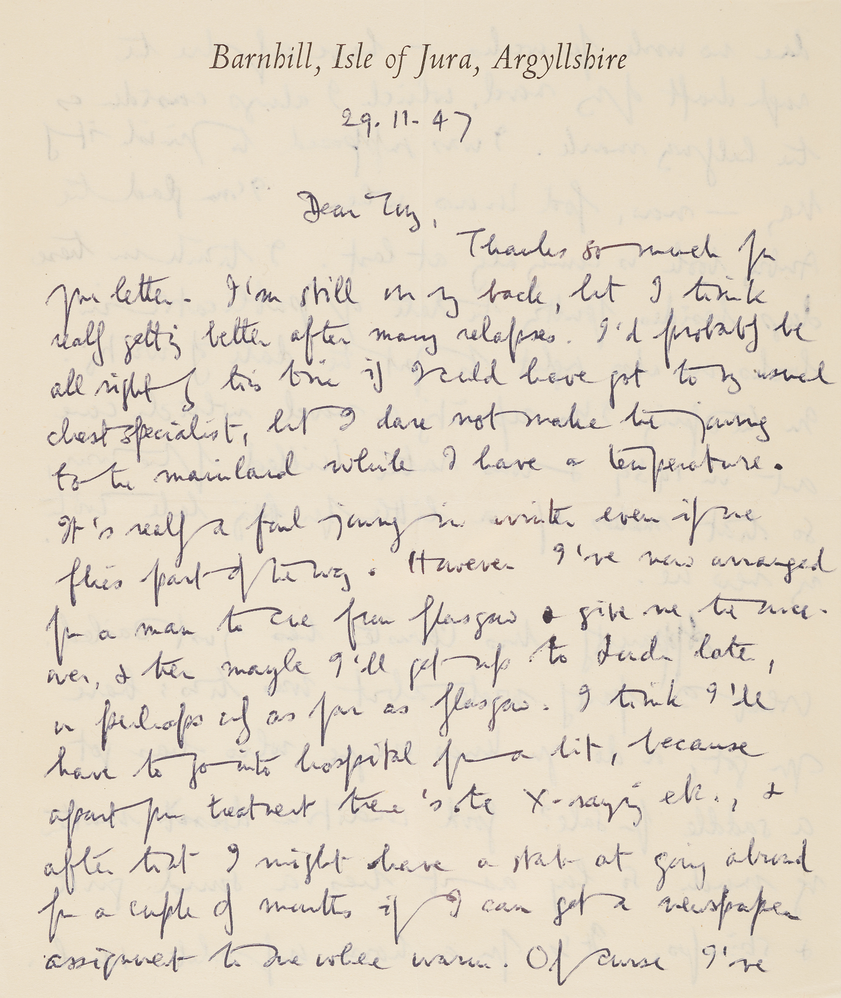 Written at Barnhill during his final and most demanding creative period, the letter captures Orwell at work on Nineteen Eighty-Four, offering a candid account of its slow progress under deteriorating health and isolation. The work would ultimately be published by Secker & Warburg on June 8, 1949, quickly becoming a bestseller in England and abroad, and has since established itself as one of the defining literary works of the twentieth century.