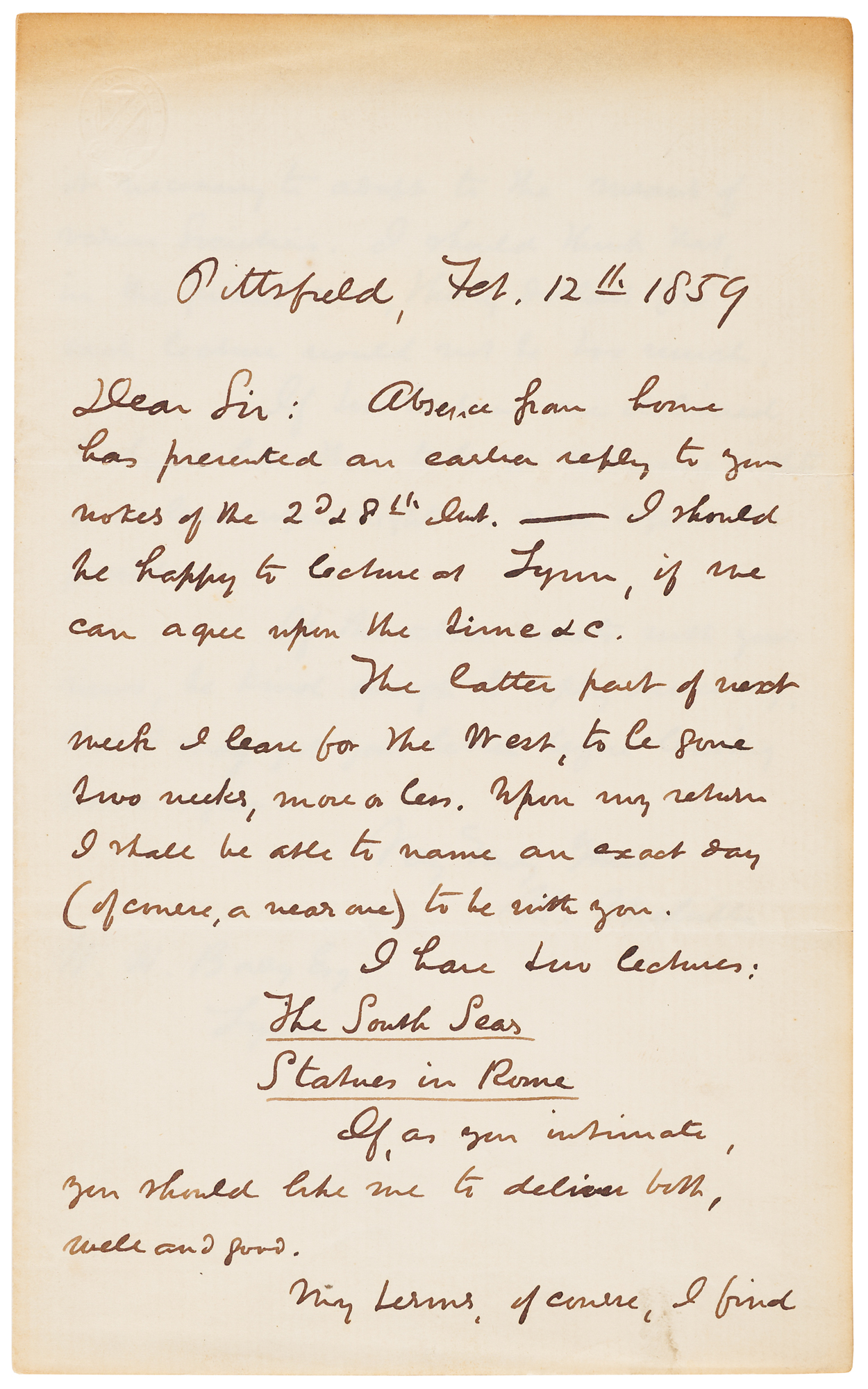 Handwritten 1859 letter from Melville arranging paid lectures, including “The South Seas,” as he turns to lecturing amid financial strain