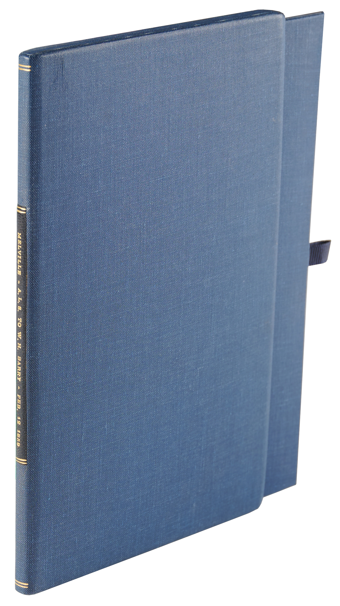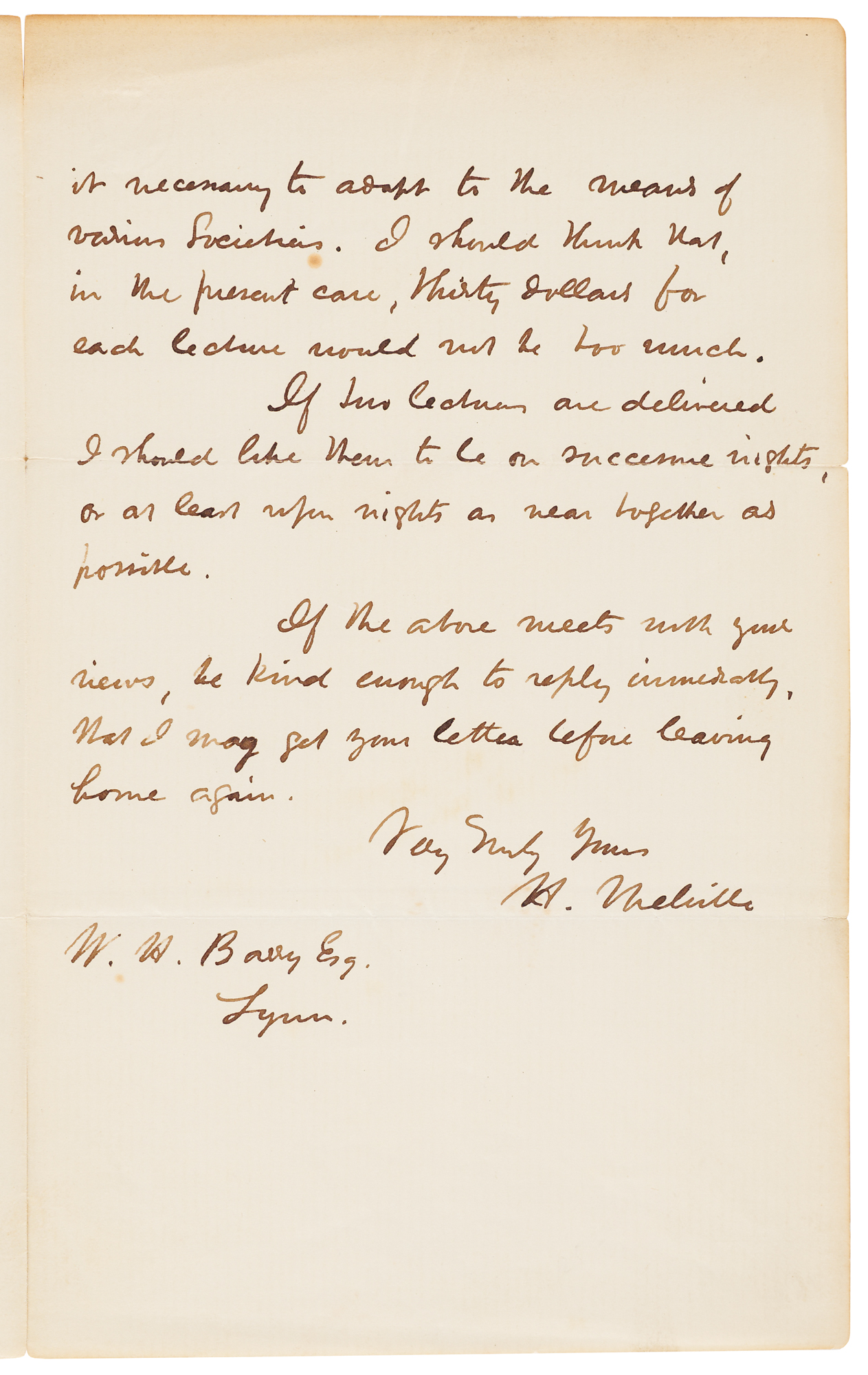 ALS signed “H. Melville,” two pages on two adjoining sheets, 5 x 8, February 12, 1859. Handwritten letter from Pittsfield to W. H. Barry arranging a lecture engagement, in part: “I should be happy to lecture at Lynn, if we can agree on the time &c.…the latter part of next week I leave for the West, to be gone two weeks, more or less. Upon my return I shall be able to name an exact day.” Melville offers to deliver “The South Seas,” and “Statues in Rome,” noting that if both are desired they should be scheduled “on successive nights, or at least upon nights near together as possible,” and adds of his fee that “thirty dollars for each lecture would not be too much.” In fine condition, with toning to the edges, and partial splitting along the hinge. Accompanied by a custom slipcase with matching chemise.